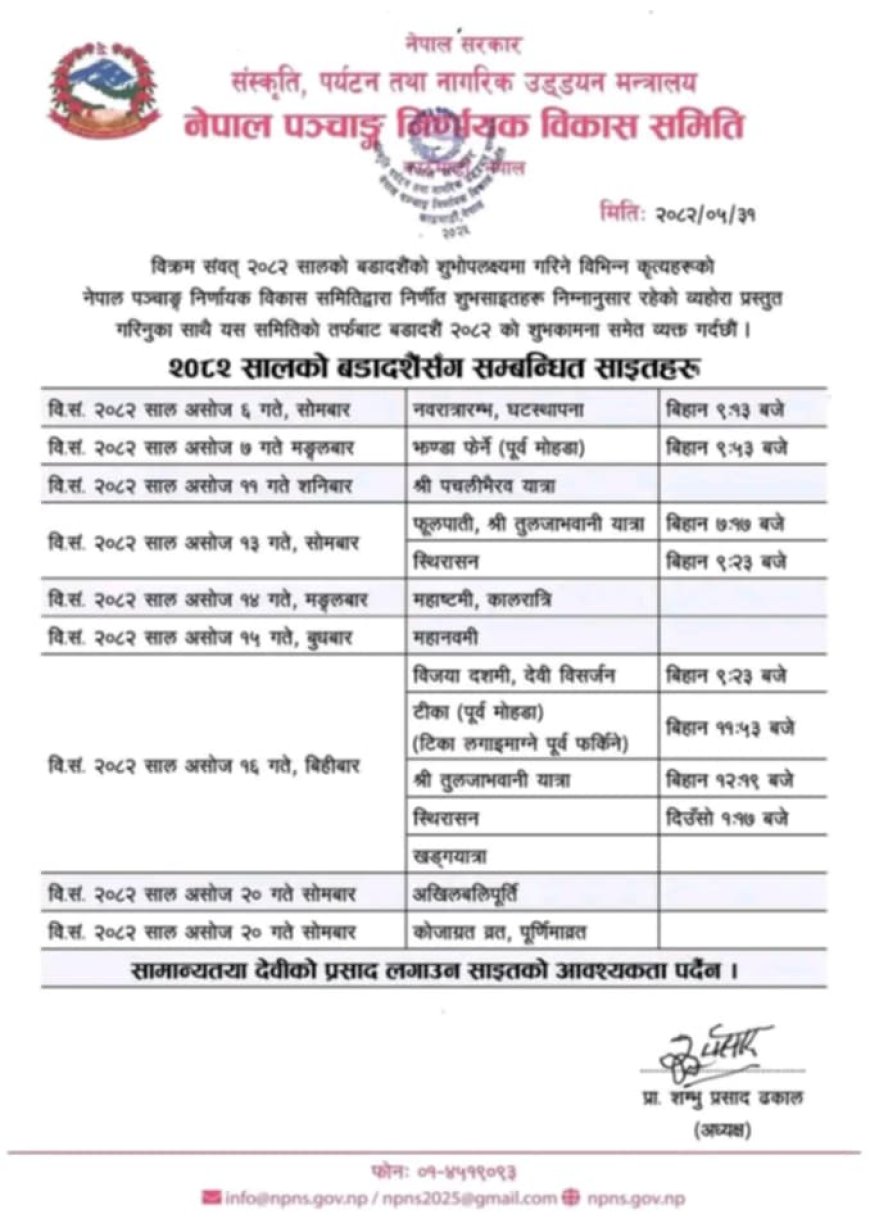 आज नभ्याउनेले कोजाग्रत पूर्णिमासम्म पनि मान्यजनबाट टीका ग्रहण गर्न सक्नेछन् । आजदेखि पूर्णिमासम्म मान्यजनबाट दुर्गाको प्रसादका रूपमा टीका ग्रहण गर्दा अन्य फूलका साथै घटस्थापनाका दिनमा वैदिक विधिपूर्वक राखिएको पहेँलो जमरालाई समृद्धिको प्रतीकको रूप मानी लगाउने गरिन्छ ।बिहान ९ बजेर २३ मिनेटको साइतमा देवी बिसर्जन गर्ने र राज्य सञ्चालकले ११ बजेर ५३ मिनेटमा टीका लगाउनुपर्ने नेपाल पञ्चाङ्ग निर्णायक विकास समितिका सदस्य डा.बासुदेव कोइराला (वासुदेवकृष्ण शास्त्री)ले जानकारी दिनु भयो ।