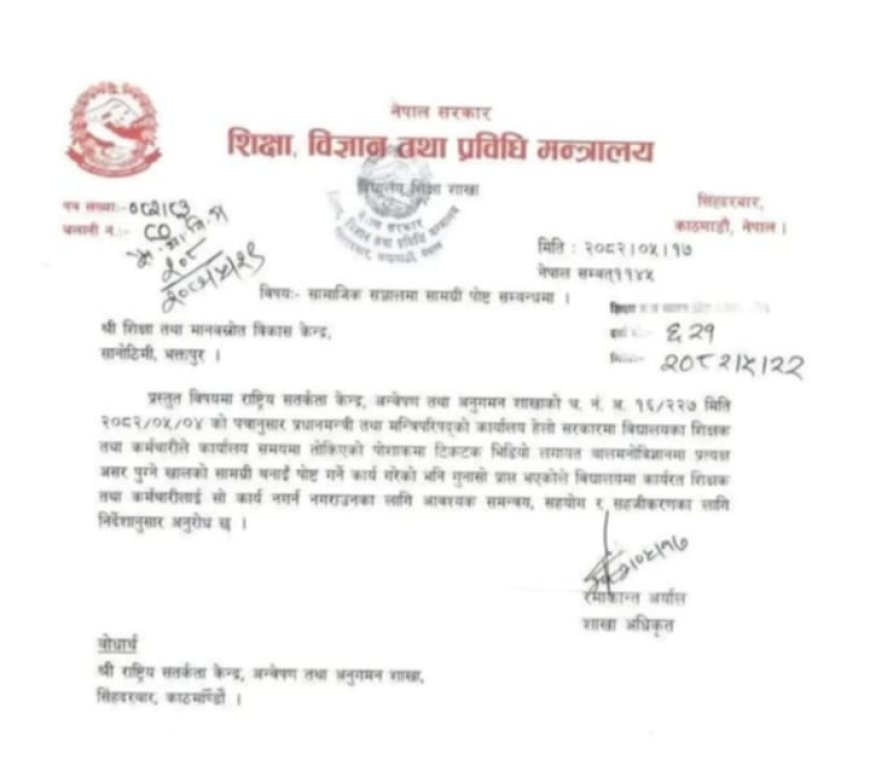 मन्त्रालयले सूचना निकालेर प्रधानमन्त्री तथा मन्त्रिपरिषद्को कार्यालय हेलो सरकारमा विद्यालयका शिक्षक तथा कर्मचारीले कार्यालय समयमा तोकिएको पोशाकमा टिकटक भिडियो लगायत बाल मनोविज्ञानमा प्रत्यक्ष असर पुग्ने खालको सामग्री बनाई पोस्ट गर्ने गुनासो प्राप्त भएको जनाएको छ ।
